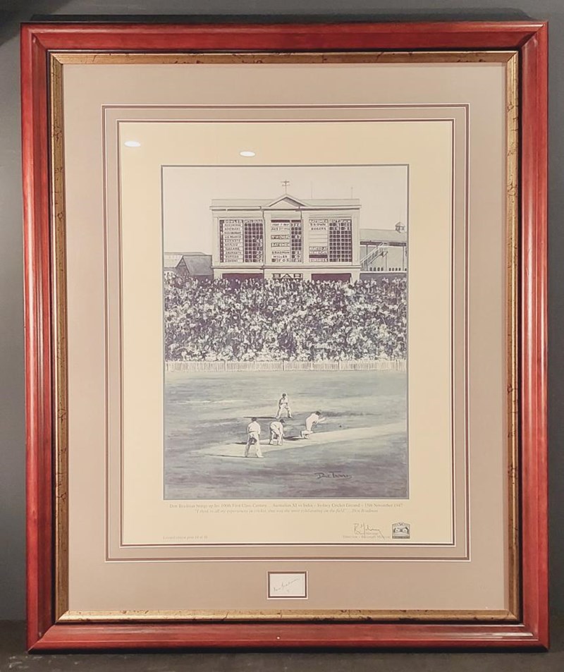 SIR DONALD BRADMAN LIMITED EDITION HANDSIGNED CARD WITH REPRODUCTION PRINT IN FRAMED DISPLAY Limited Edition 10/10 Comes With Certificate Of Authenticity From Bosman Memorabilia And Investments Size: 108cm x 90cm x 5cm Condition: Excellent