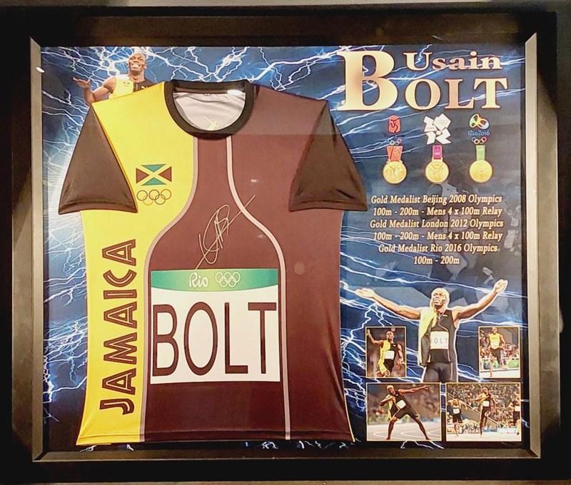 USAIN BOLT HANDSIGNED SPIKE IN FRAMED DISPLAY Comes With Certificate Of Authenticity From Centrefield Memorabilia Authentication Size: 92cm 55cm x 14cm Condition: Excellent