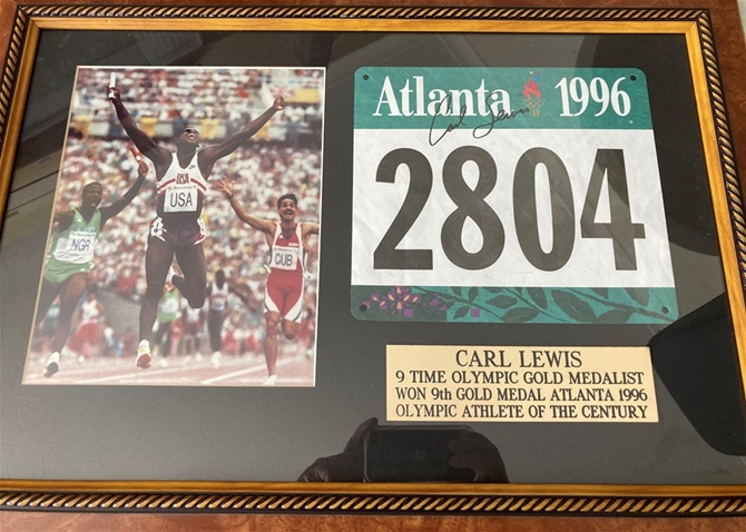 Olympic athlete great Carl Lewis personally signed number plate from the 1996 Games. This was Lewis` final gold medal adding to the 8 previously won