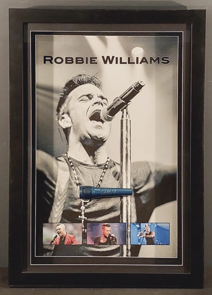 ROBBIE WILLIAMS HANDSIGNED MICROPHONE IN FRAMED DISPLAY Comes With Certificate Of Authenticity From Ama Size: 84cm x 54cm x 8cm Condition: Excellent