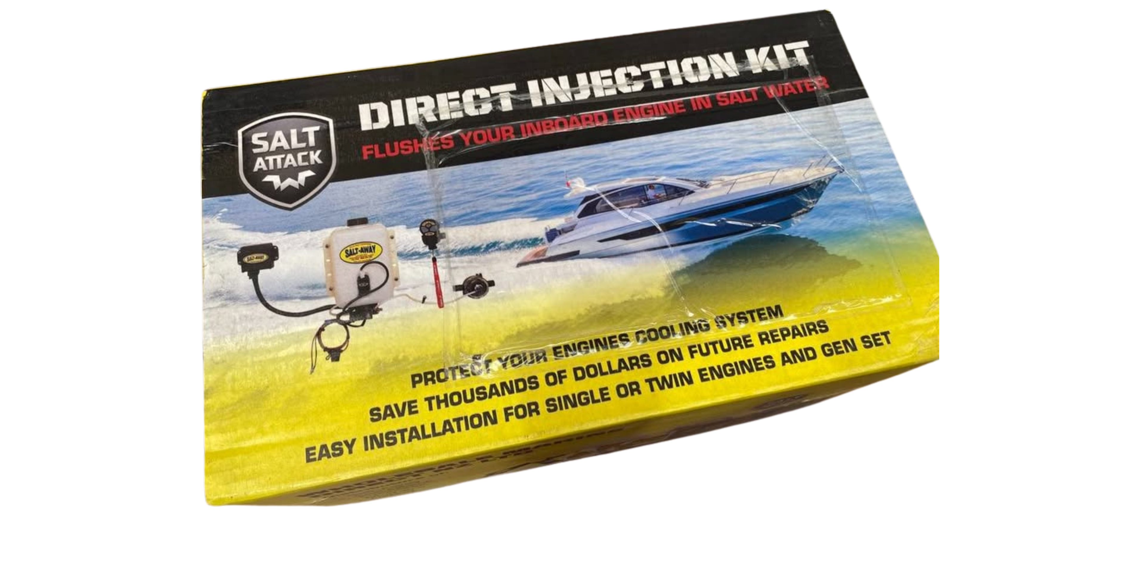 Designed to flush and protect the cooling systems of all moored vessels with inboard/outboard stern drive motors. This Kit protects all open and closed circuit salt water cooling systems by injecting 50/50 mixture of Salt-Attack concentrate and fresh water. Salt-Attack's unique formula protects your engine's cooling system using salt water. Wireless version allows for easy use and installation, no wiring required forward of the motor Simply control your unit remotely using the remote control supplied. connects to 12V, comes ready to install with all wiring, tubing, wireless unit and quick connect fittings.