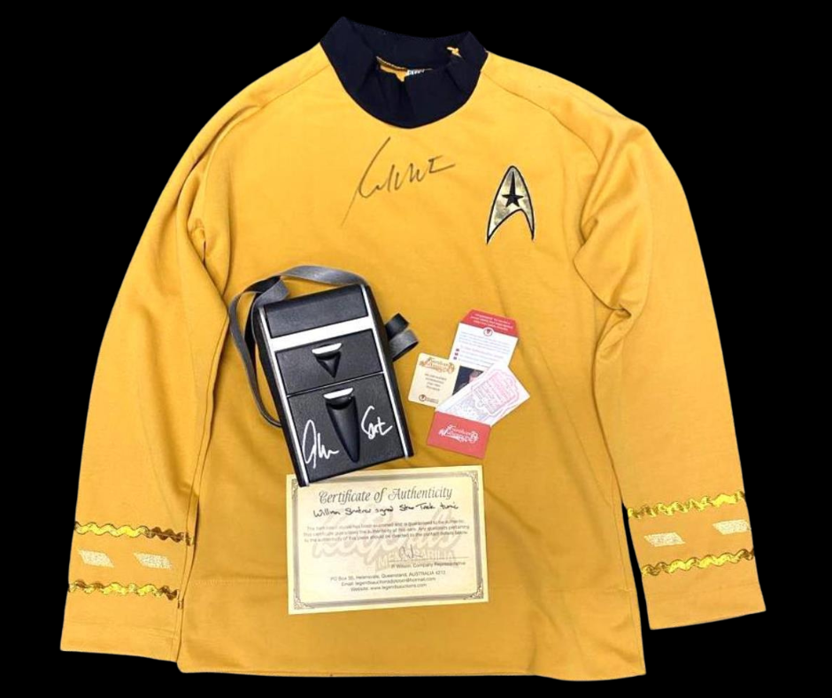 WILLIAM SHATNER AUTOGRAPHED STAR TREK TUNIC PLUS REPLICA TRICORDER COA Custom "Star Trek" Style Captains Uniform Hand Signed Beautifully In Sharpie By "Captain Kirk"; William Shatner With Coa Plus Classic Science Tricorder. Tricorder Has Been Personally Hand-Signed By Series Icon William Shatner During His Autograph Signing With Celebrity Authentics. No Landing Party Is Comp..