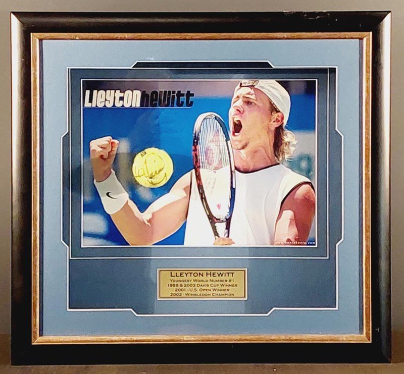 LLEYTON HEWITT HANDSIGNED TENNIS BALL IN FRAMED DISPLAY Comes With Certificate Of Authenticity From True Blue Collectables Size: 57cm x 62cm x 11cm Condition: Excellent